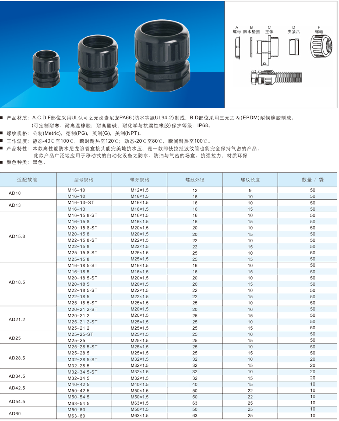 波纹管系列产品材质:A.C.D.F部位采用UL认可之无卤素尼龙PA66(防水等级UL94-2)制成,B.D部位采用三元乙丙(EPDM)耐候橡胶制成。 (可定制耐寒,耐高温橡胶;耐高酸碱、耐化学与抗腐蚀橡胶)保护等级:IP68.