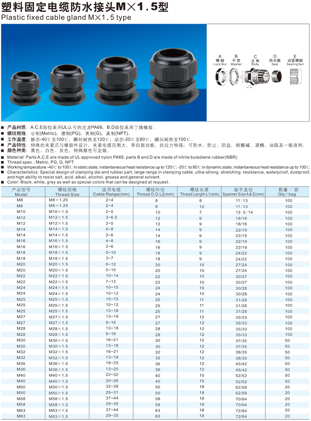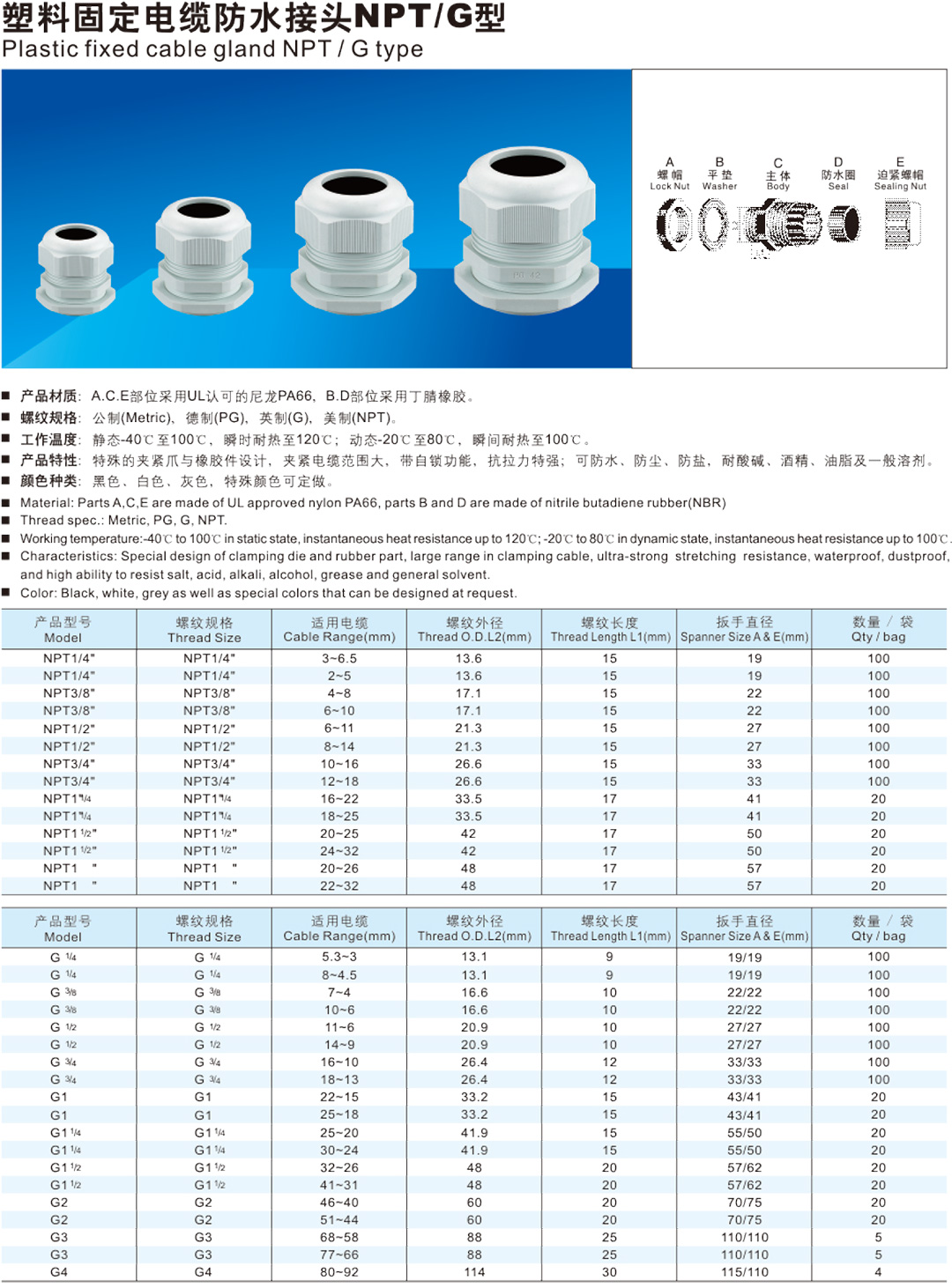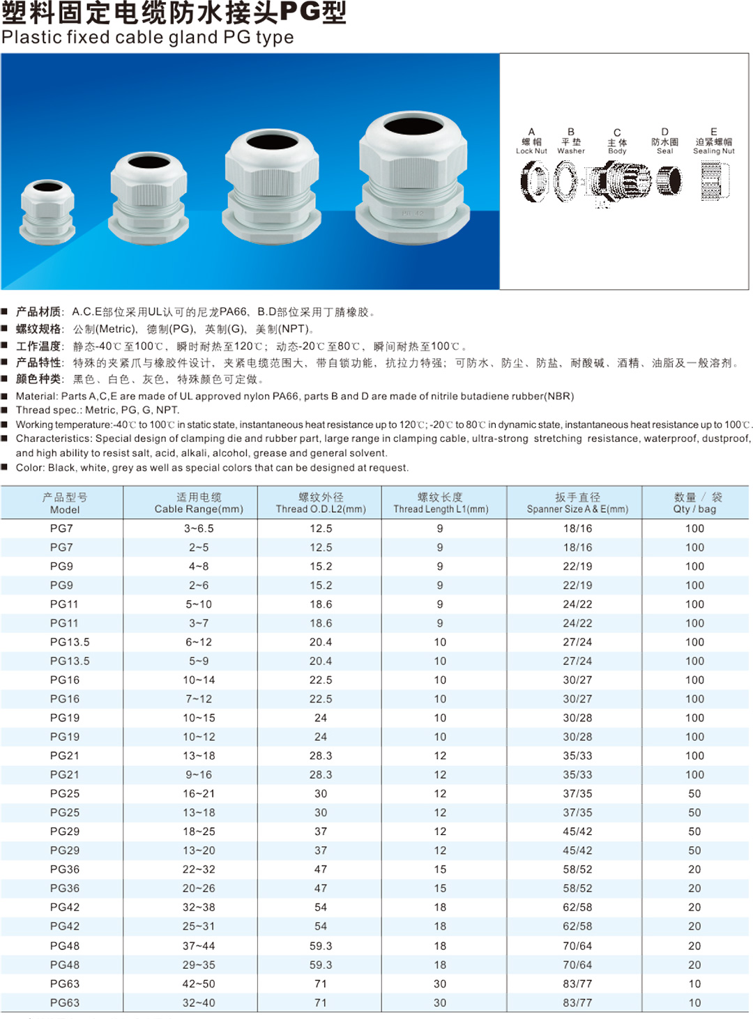 防水接头系列产品材质:A.C.E部位采用UL认可的尼龙PA66, B.D部位采用丁腈橡胶。