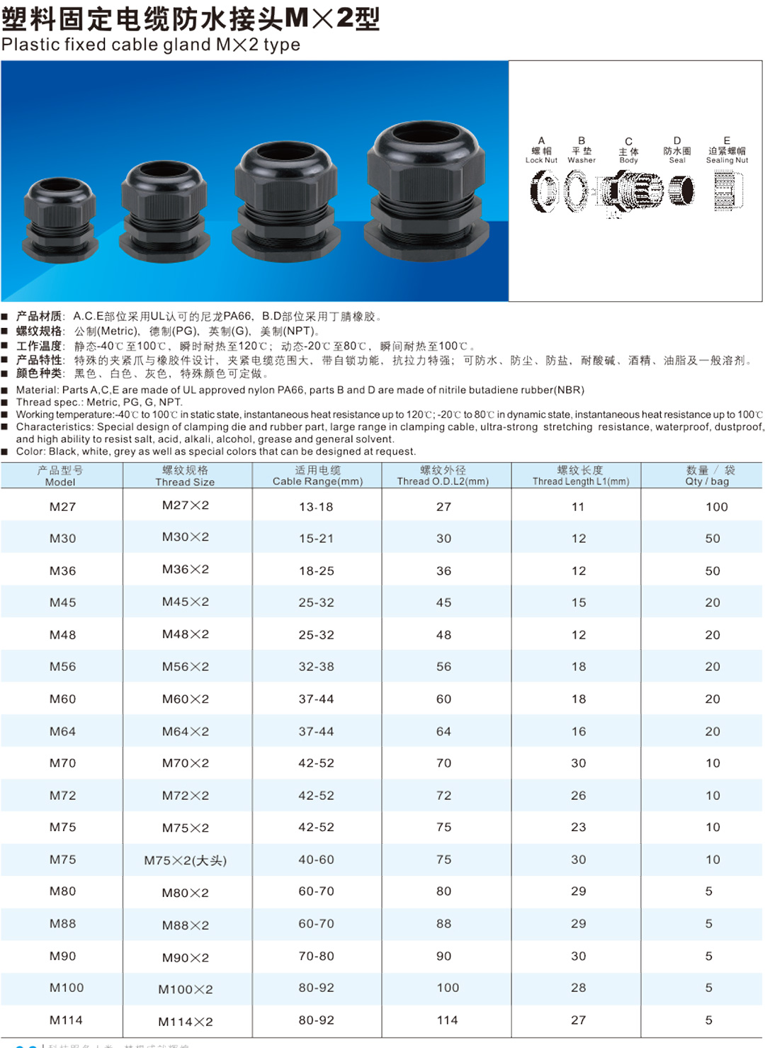 产品特性:特殊的夹紧爪与橡胶件设计,夹紧电缆范围大,带自锁功能,抗拉力特强;可防水、 防尘、防盐,耐酸碱、酒精、油脂及一般溶剂。