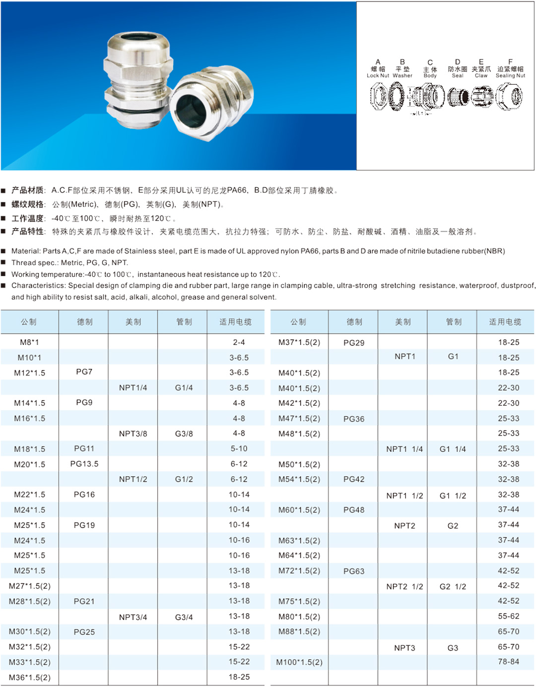 金属接头系列产品材质:A.C.F部位 采用不锈钢,E部分采用UL认可的尼龙PA66,B.D部位采用丁腈橡胶。
